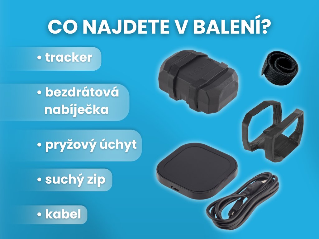 Obsah balení: GPS tracker Mala, bezdrátová nabíjecí podložka, pryžový úchyt, suchý zip