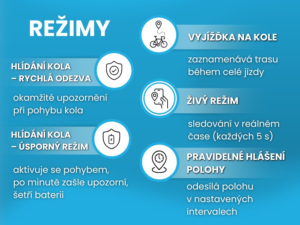 Režimy jsme navrhli na míru pro vaše kolo – kromě režimu Vyjížďka na kole, který využijete pro vaše výlety, se vám bude určitě hodit Hlídání kola, díky kterému budete ihned vědět, zda se s vaším kolem něco děje. V případě, že dojde k odcizení, přijde vhod Živý režim, abyste mohli vaše kolo rychle dohledat, ať je kdekoliv. Pro úsporu baterie trackeru je pro vás v aplikaci připraven režim Kolo doma / Převoz kola. Naložte kolo na střechu auta a hurá za dobrodružstvím!