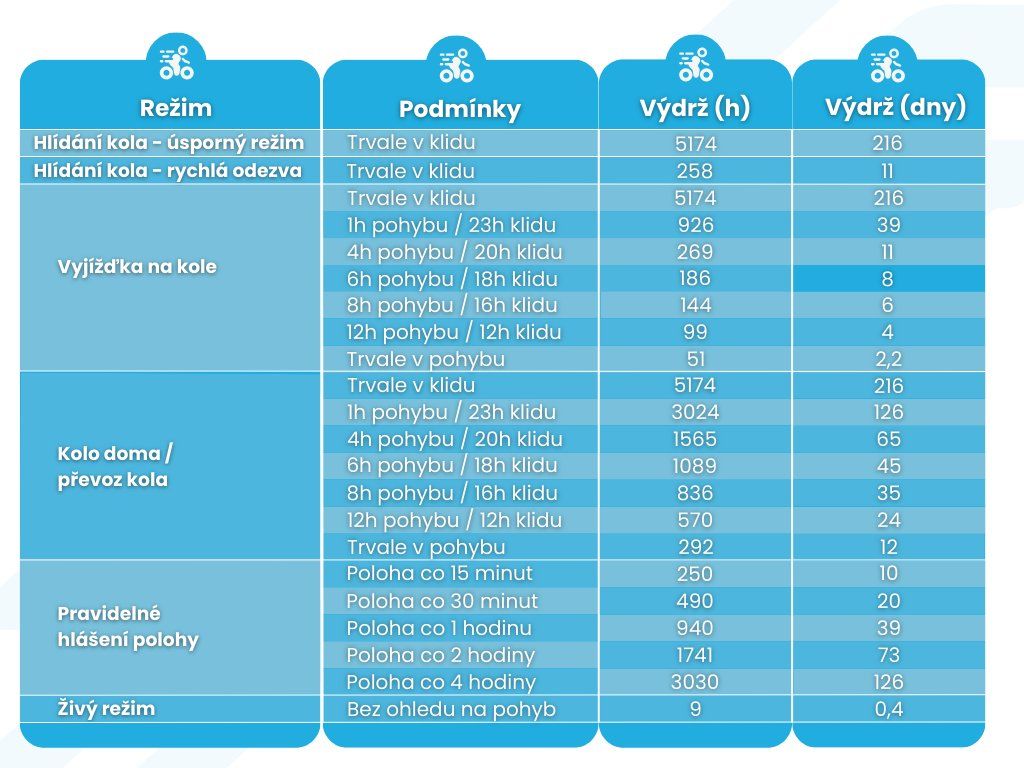 Režimy jsme navrhli na míru pro vaše kolo – kromě režimu Vyjížďka na kole, který využijete pro vaše výlety, se vám bude určitě hodit Hlídání kola, díky kterému budete ihned vědět, zda se s vaším kolem něco děje. V případě, že dojde k odcizení, přijde vhod Živý režim, abyste mohli vaše kolo rychle dohledat, ať je kdekoliv. Pro úsporu baterie trackeru je pro vás v aplikaci připraven režim Kolo doma / Převoz kola. Naložte kolo na střechu auta a hurá za dobrodružstvím!