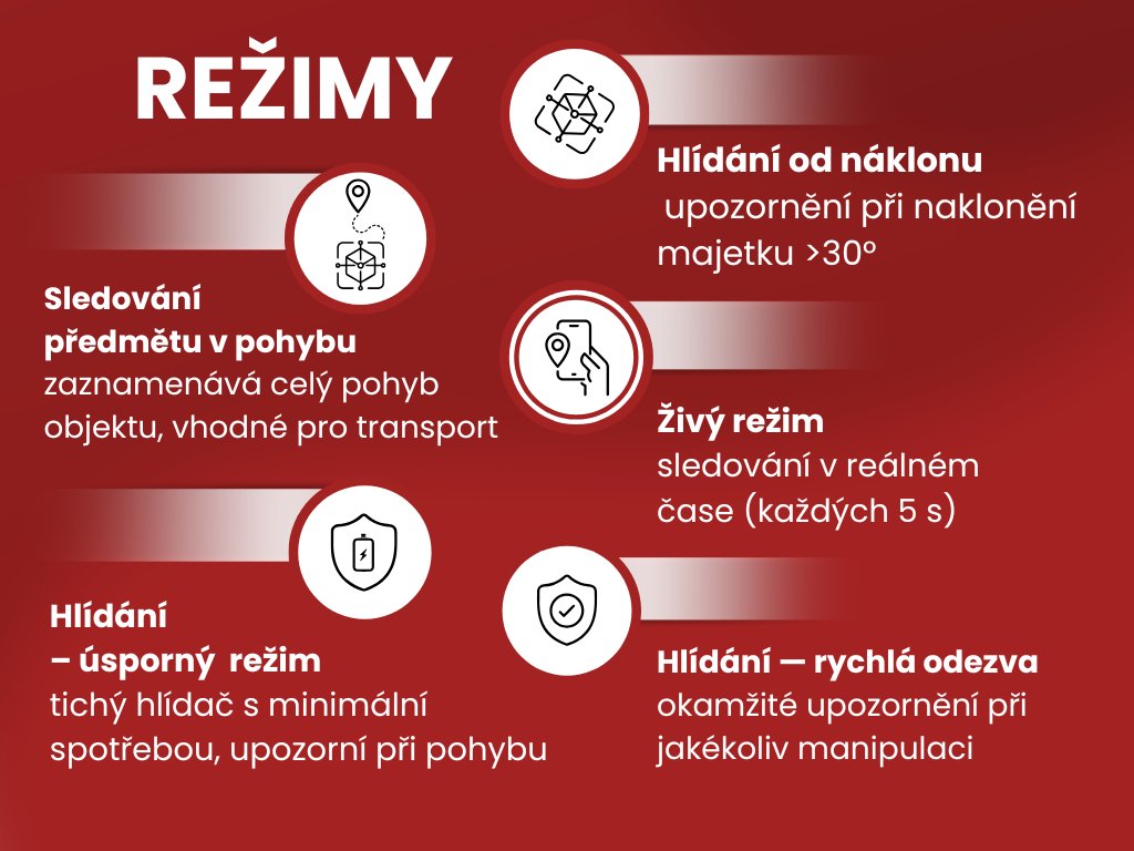 Režimy jsme pro vás navrhli na míru tak, ať můžete hlídat vše, na čem vám záleží. Ohlídejte svá zavazadla nebo cenné balíky s režimem Sledování předmětu v pohybu. V případě, že potřebujete mít informaci o poplachu ihned, využijete režim Hlídání s rychlou odezvou. Pokud pro vás hraje roli dlouhá výdrž baterie na jedno nabití a informace o poplachu vám bude stačit doručit za 1 minutu, zvolíte režim Hlídání v úsporném režimu. Pokud nepotřebujete sledovat otřesy, ale je pro vás důležitější sledovat náklony, nastavíte Hlídání od náklonu.