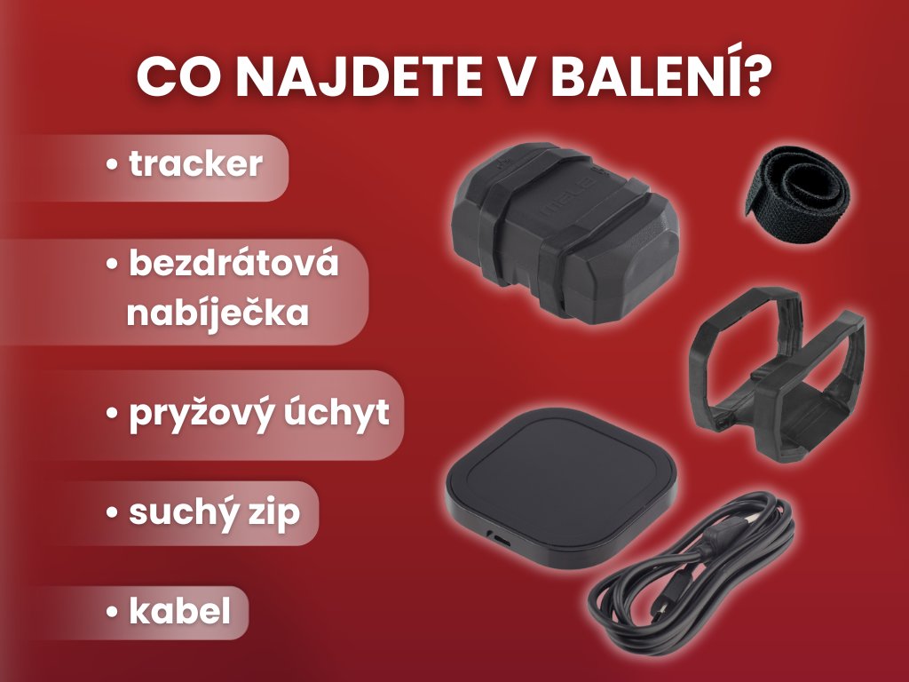 Obsah balení: GPS tracker Mala, bezdrátová nabíjecí podložka, pryžový úchyt, suchý zip