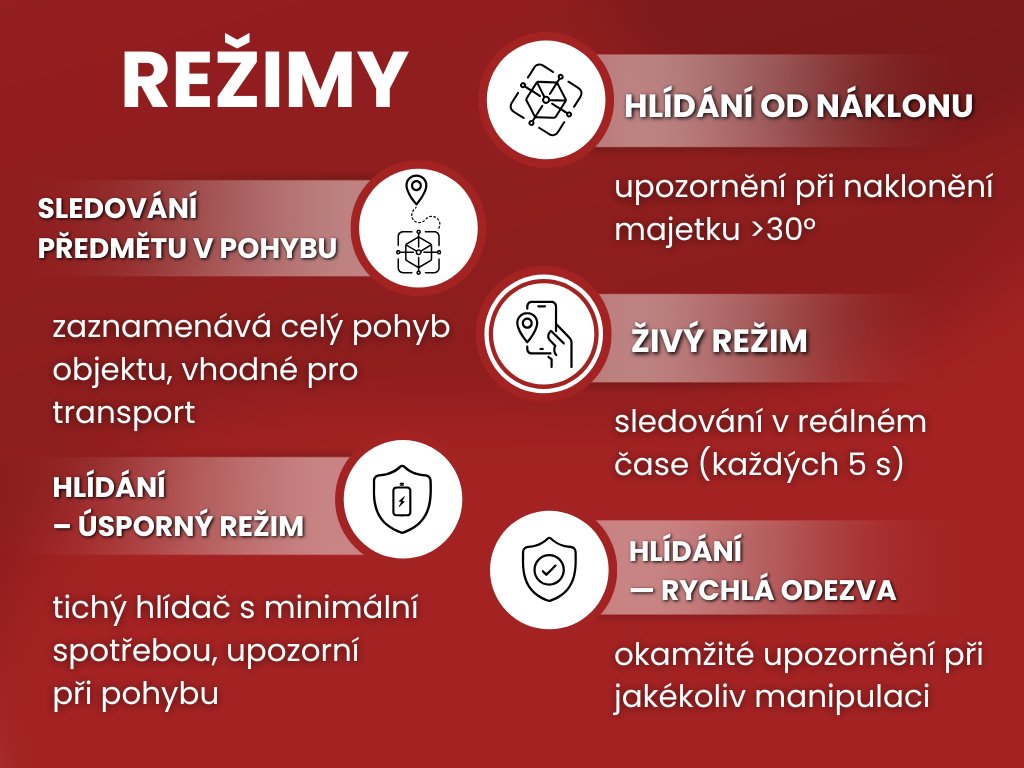 Režimy jsme pro vás navrhli na míru tak, ať můžete hlídat vše, na čem vám záleží. Ohlídejte svá zavazadla nebo cenné balíky s režimem Sledování předmětu v pohybu. V případě, že potřebujete mít informaci o poplachu ihned, využijete režim Hlídání s rychlou odezvou. Pokud pro vás hraje roli dlouhá výdrž baterie na jedno nabití a informace o poplachu vám bude stačit doručit za 1 minutu, zvolíte režim Hlídání v úsporném režimu. Pokud nepotřebujete sledovat otřesy, ale je pro vás důležitější sledovat náklony, nastavíte Hlídání od náklonu.