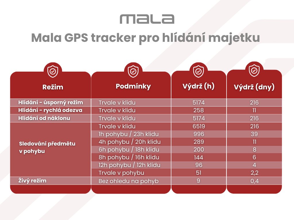GPS tracker Mala pro hlídání majetku je malý přenosný GPS tracker, díky kterému se již nemusíte bát o svůj cenný majetek. Mala je ideálním pomocníkem pro sledování různých druhů majetku, ať už se jedná o tašku, kufr, nářadí, automobil nebo velké stroje. Navíc dokáže zaznamenat nesprávnou manipulaci majetku v přesáhnutí úhlu náklonu 30°.