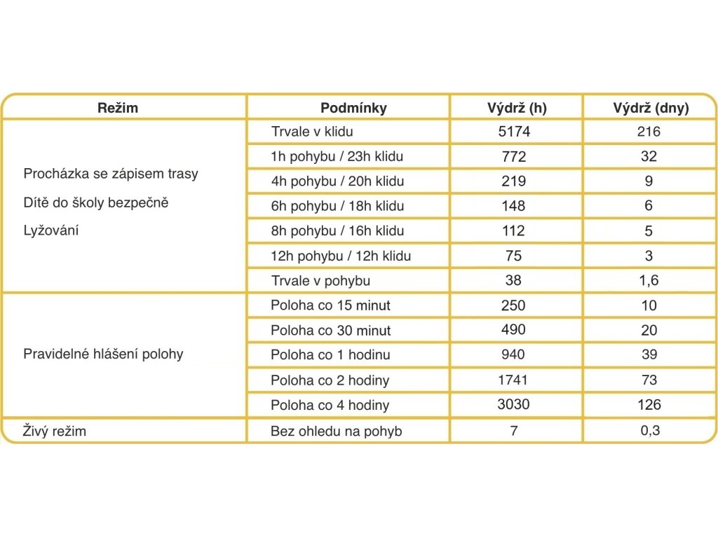 Režimy jsme navrhli na míru pro vaše osobní použití – pokud máte rádi výlety, přijde vám vhod režim Procházka se zápisem trasy, díky kterému budete mít dokonalý přehled o vašich dobrodružstvích. Sledujte pravidelné cesty vašeho dítěte s režimem Dítě do školy bezpečně a buďte v klidu. Na horách oceníte režim Lyžování. A ty nejaktuálnější informace o poloze v reálném čase vám poskytne Živý režim, kde je poloha z trackeru odesílána každých 5 sekund.