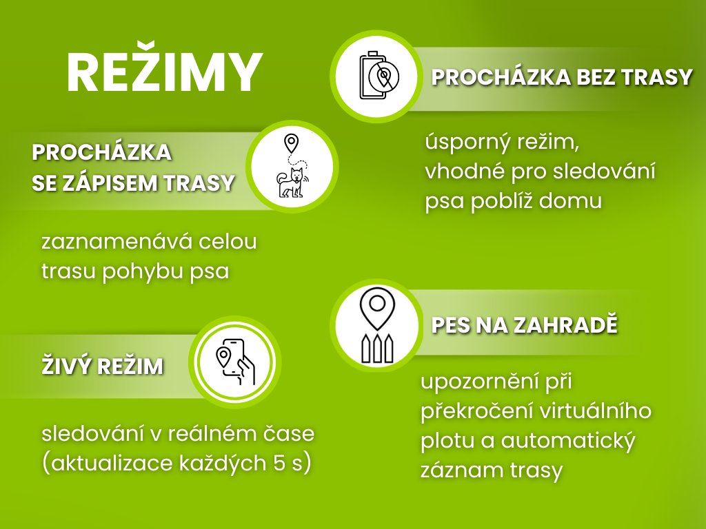 Různé provozní režimy: Sledování psa přizpůsobené vašim potřebám.